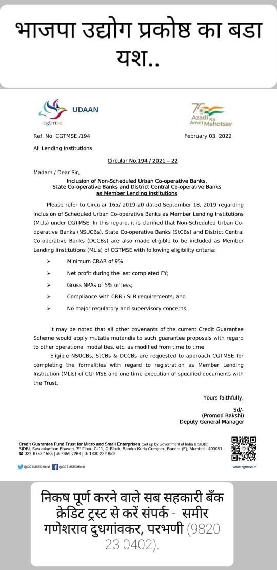 | सहकारी बँकांचा CGTMSE मध्ये समावेश |