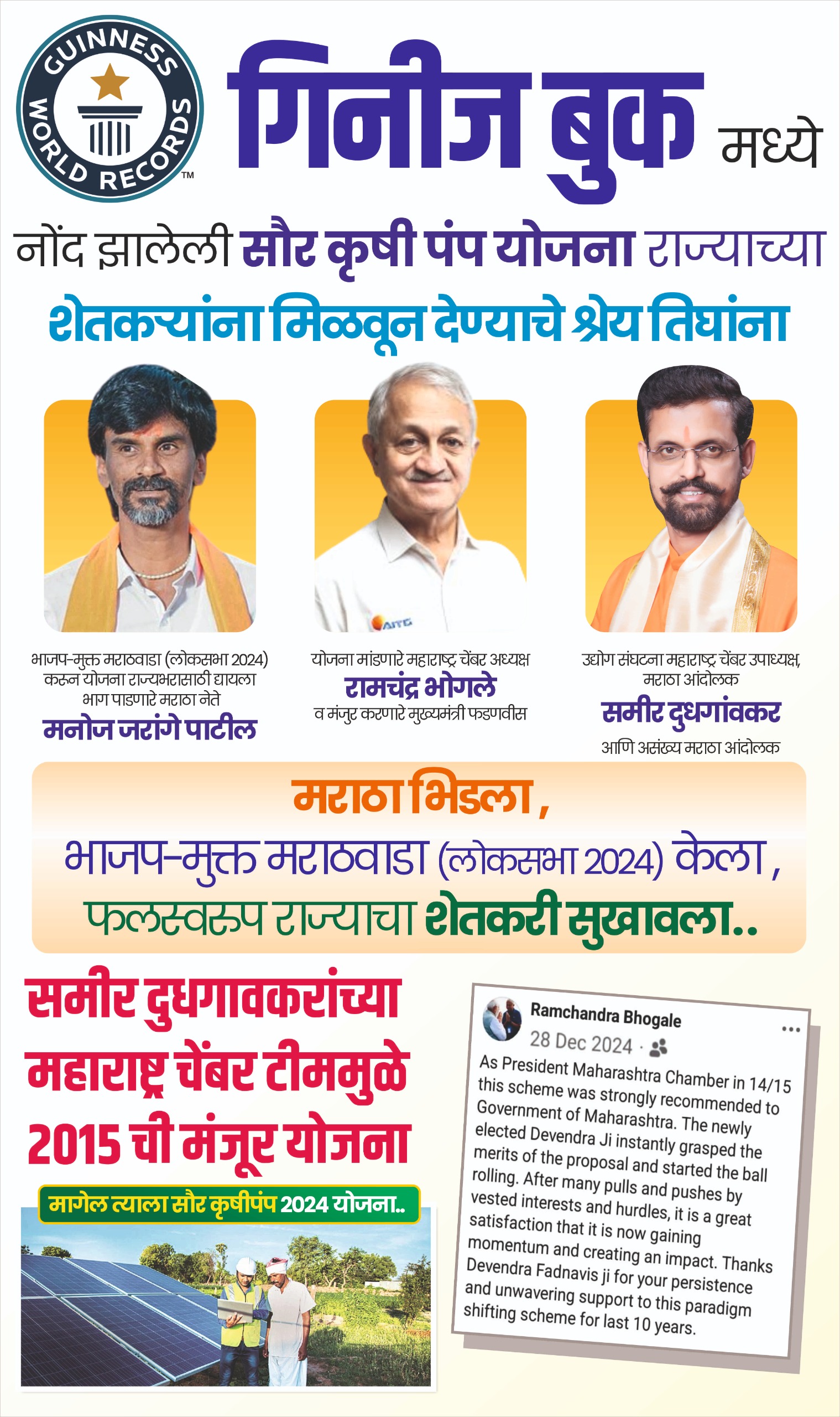 ऑक्टोबर २०२५ महिन्यात महाराष्ट्राचे नाव गिनीज बुक मध्ये नेण्यासाठी कारणीभूत “मागेल त्याला सौर कृषिपंप” योजना मंजूर करून घेणारे राज्य उद्योग नेतृत्व आणि मराठा आंदोलक