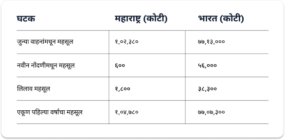 जुन्या वाहनांमुळे महाराष्ट्राला १,०२,३८० कोटी आणि भारताला ७७,१३,००० कोटींचा एक रकमी महसूल अपेक्षित आहे, जो पहिल्या वर्षातील प्रमुख योगदान असेल. एकूण महसूल राज्याच्या वार्षिक बजेटचा लक्षणीय भाग (महाराष्ट्रासाठी ~२८%) भरून काढू शकतो.