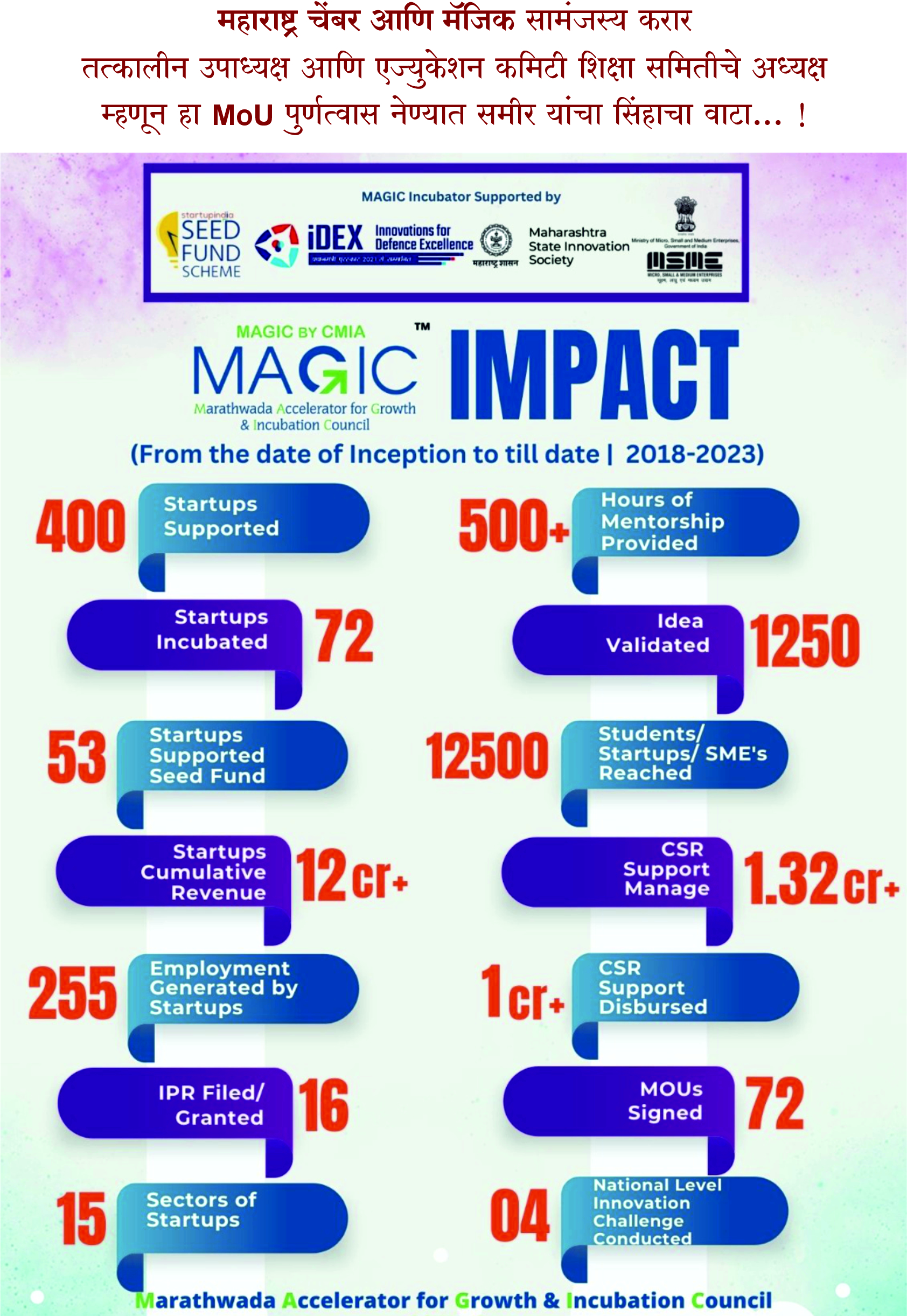 - प्रभावाबाबत मत: या उपक्रमांमुळे हजारो तरुणांना, महिलांना कौशल्य विकास आणि रोजगाराच्या संधी, नवउद्योजकांना प्रोत्साहन मिळाले आहे आणि मराठवाड्यासह संपूर्ण महाराष्ट्रात स्टार्टअप आणि उद्योजकता इकोसिस्टमला बळकटी मिळाली, ज्यामुळे आर्थिक समृद्धी आणि सामाजिक विकासाला चालना मिळणार
