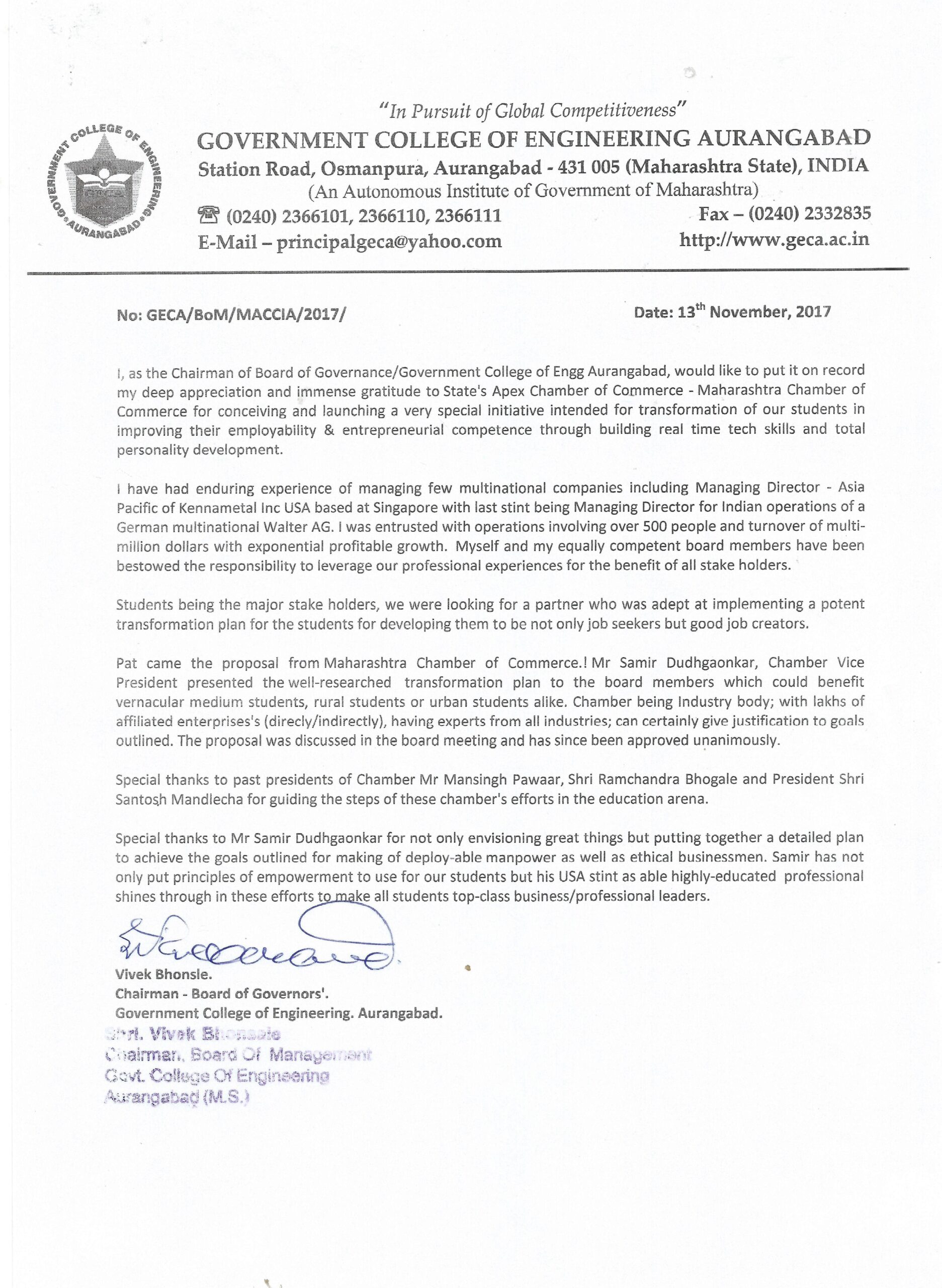 - ४ मार्च २०१५ रोजी औरंगाबाद येथे मराठवाडा शिक्षण प्रसारक मंडळ (MSPM) आणि MACCIA यांच्यात शैक्षणिक आणि औद्योगिक क्षेत्रांना जोडणारा MoU घडवून आणला, ज्यामुळे अनेक संस्थांना उद्योगजगताशी जोडण्यात यश मिळाले.