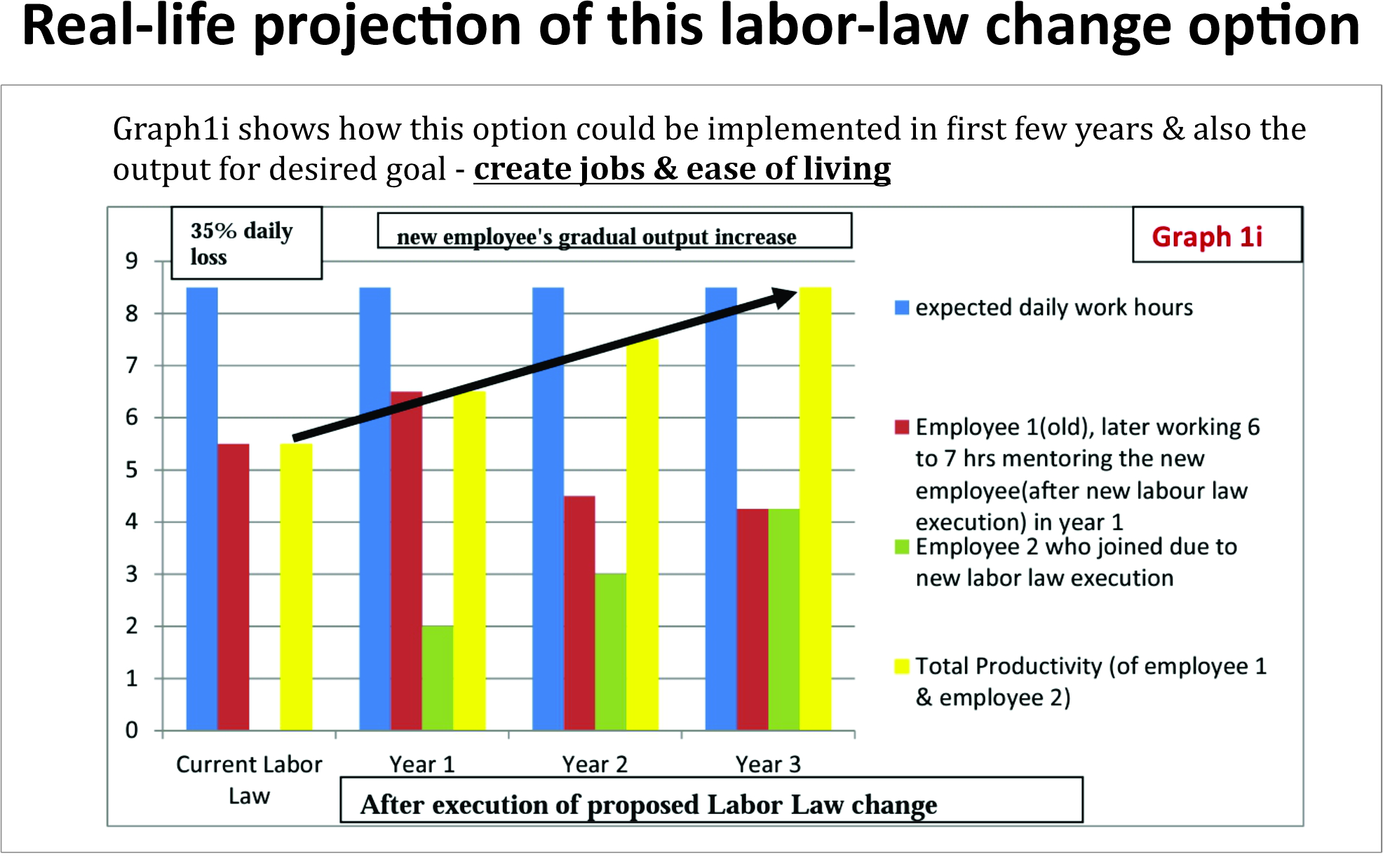 - प्रस्तावित धोरण: सध्या कर्मचारी ९ तास काम करतात, परंतु तज्ञांच्या मते, अनेक कर्मचारी केवळ ५ तास प्रभावीपणे कार्य करतात. म्हणून ५ तासांची ड्युटी अनिवार्य करून दुसऱ्या व्यक्तीला नोकरीची संधी देण्याचा कायदा असला पाहिजे. यामुळे एकूण १० तासांचे कार्य अखंडित राहील, देशाच्या उत्पादकतेला चालना मिळेल आणि करोडो नवीन नोकऱ्या तात्काळ निर्माण होतील.