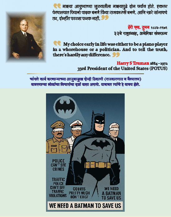 असे चुकीच्या प्रवृत्तींना समर्थन देणाऱ्या मतदार/जनसामान्य/सुशिक्षित वर्ग यांनीच चांगल्या व्यक्तींना बाजूला सारण्यास हातभार लावला आहे असे म्हणता येईल. भारतातील आजची अव्यवस्था — भ्रष्टाचार, शासकीय अकार्यक्षमता/ न्यायव्यवस्थेतील प्रलंबित प्रकरणे आणि सामाजिक विघटन —
